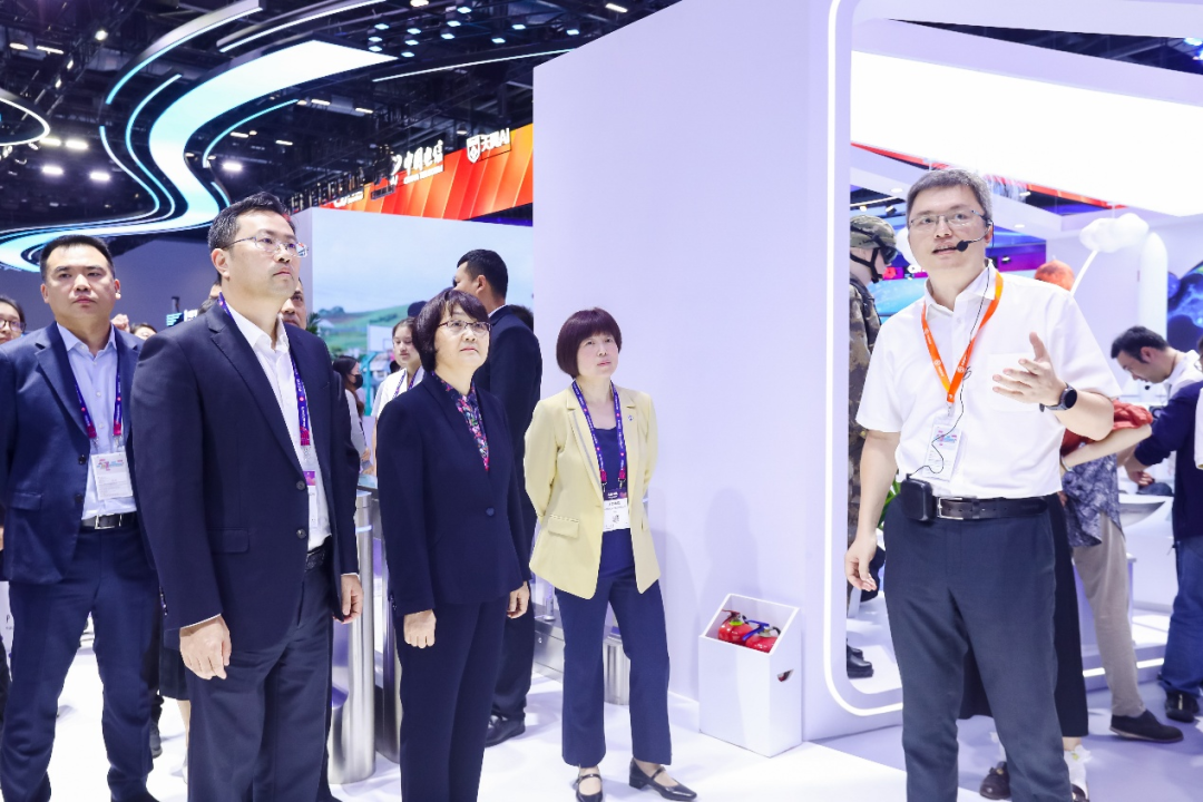 展会首日,工业和信息化部总工程师钟志红一行莅临中国信科展台,听取了中国信科副总经理曾军关于星地融合、AI全光网络、光模块等方面的实践成果介绍。